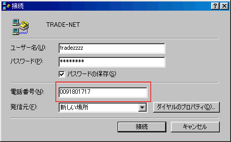 「マイコンピュータ」→「ダイヤルアップネットワーク」を開きます。 「TRADE-NET」のアイコンをダブルクリックします。