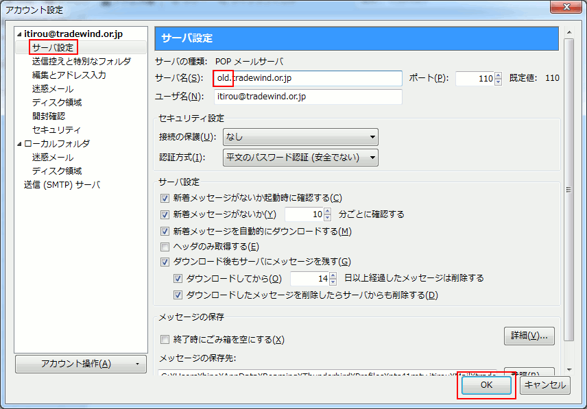 旧メールサーバから受信終了後、必ずサーバ名(S)pop.tradewind.or.jp に戻してください。