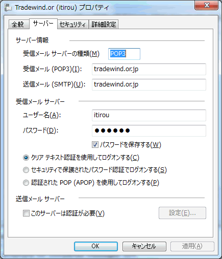 ●「サーバ」タグをクリックすると現在の設定内容が確認できます。 右の様に変更します。 |