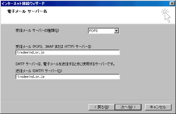 サーバー(I)」は「tradewind.or.jp」、「送信メール(SMTP)サーバー(O)」は「tradewind.or.jp」と入力し、[次へ]をクリックします。