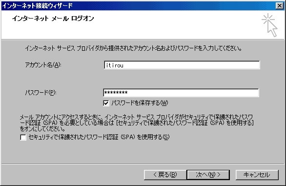 されたパスワード認証(SPA)を使用する]はチェックをしません。[次へ]をクリックします。